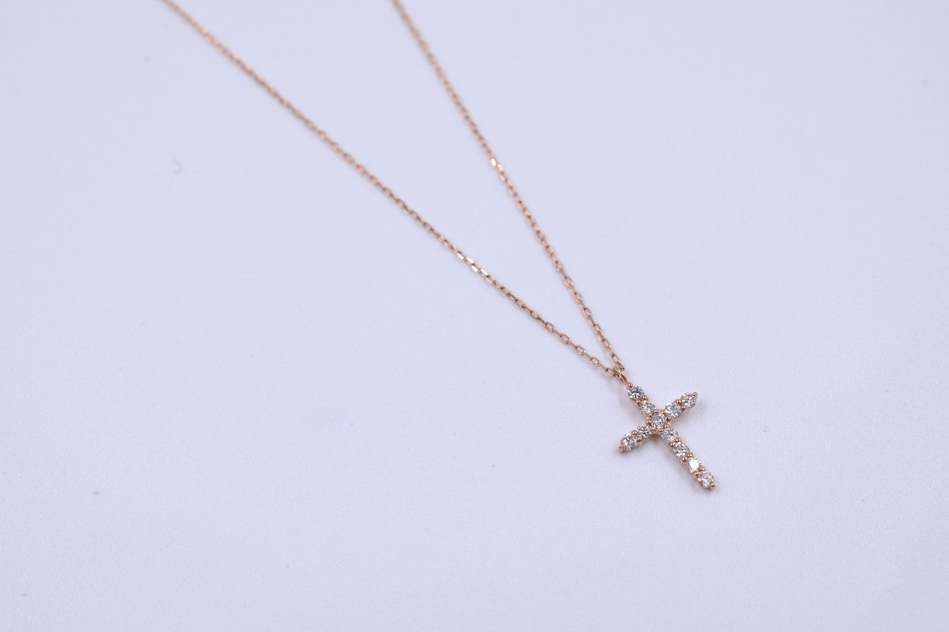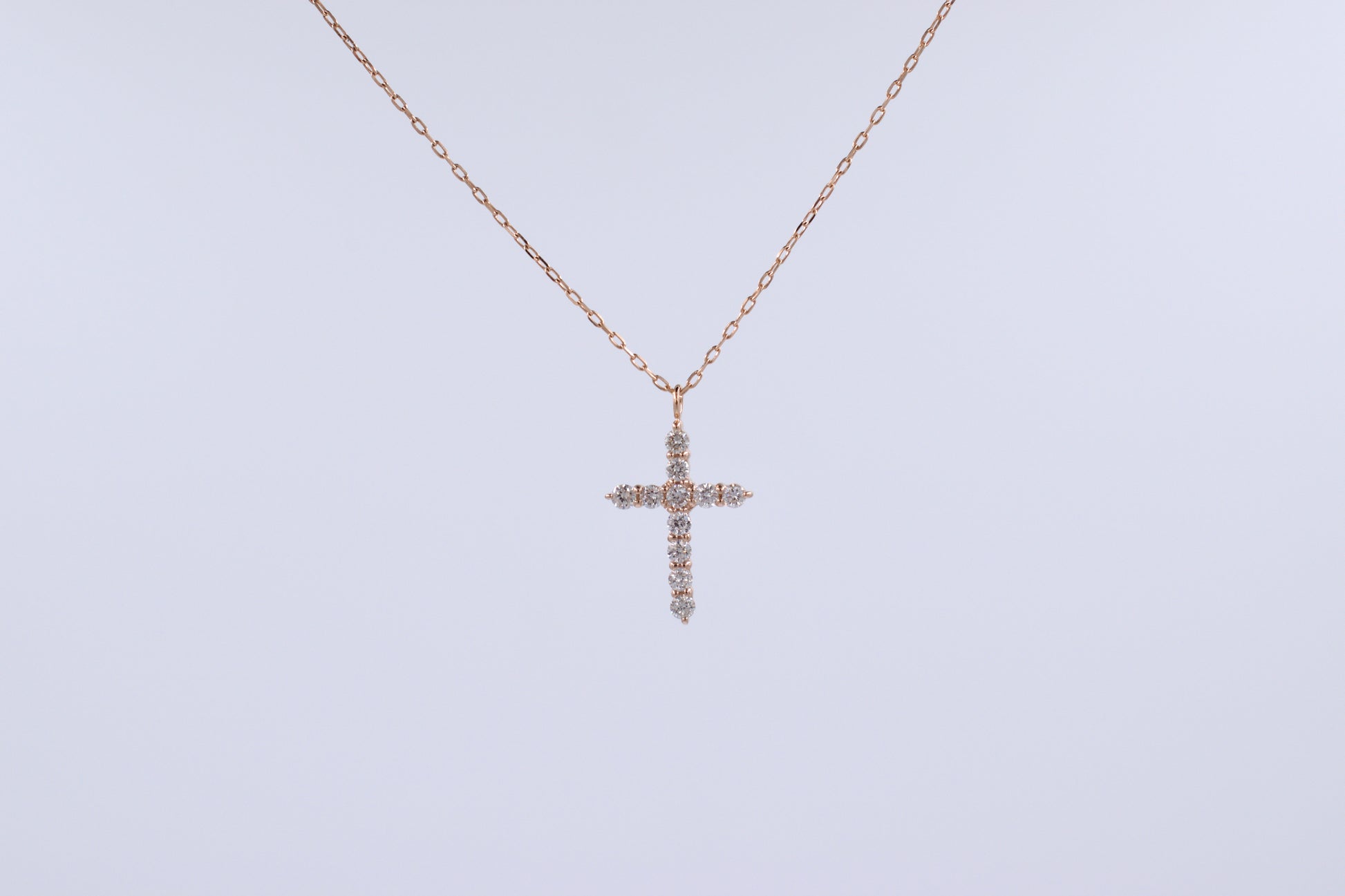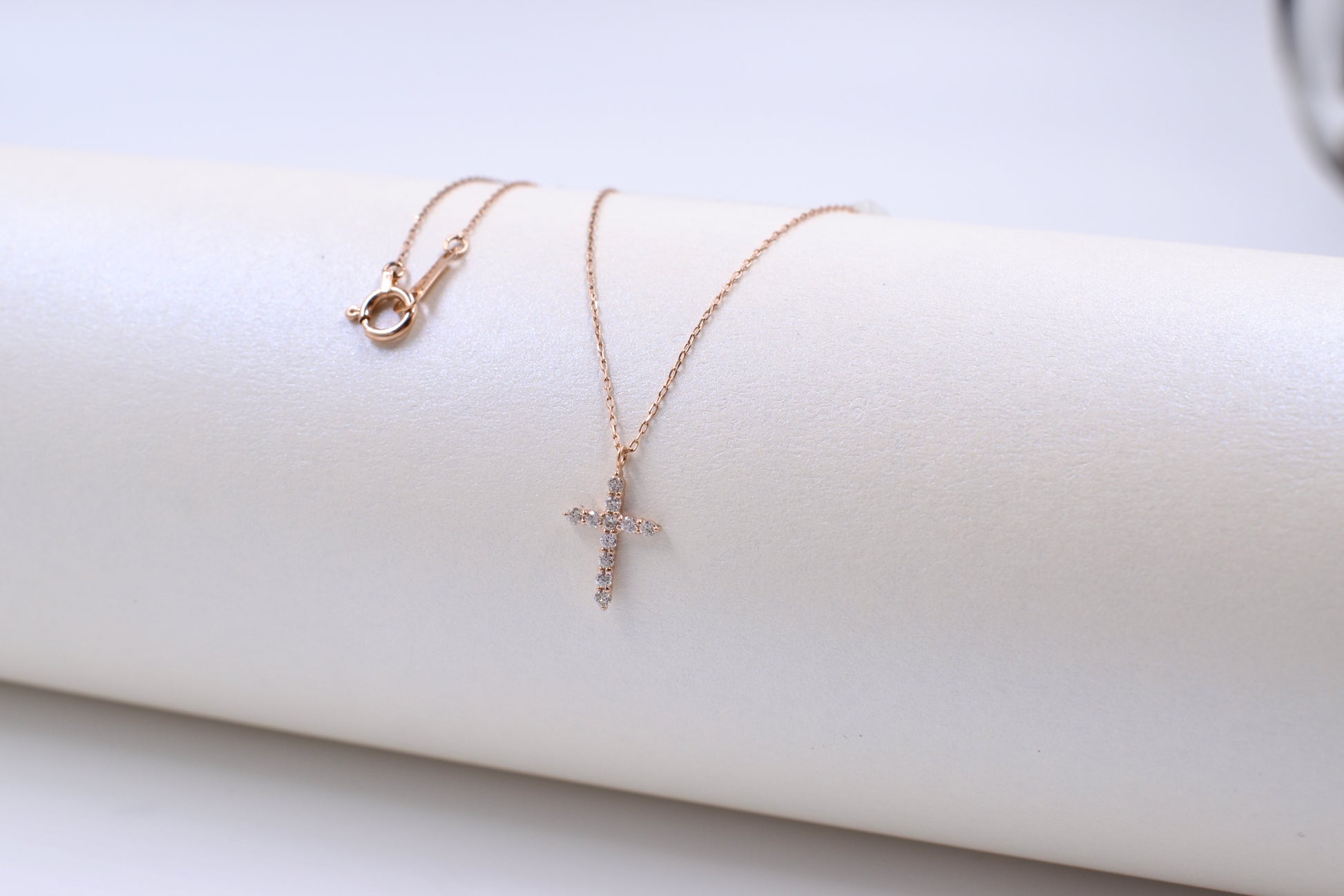 This stunning 18ct Rose Gold cross necklace features Diamonds set in a claw design, hanging from an oval open link chain with a secure bolt ring clasp.