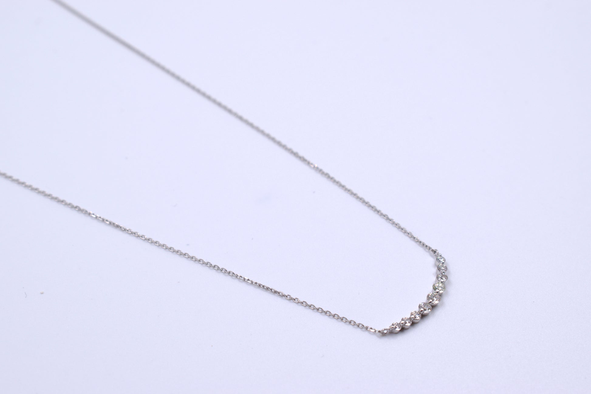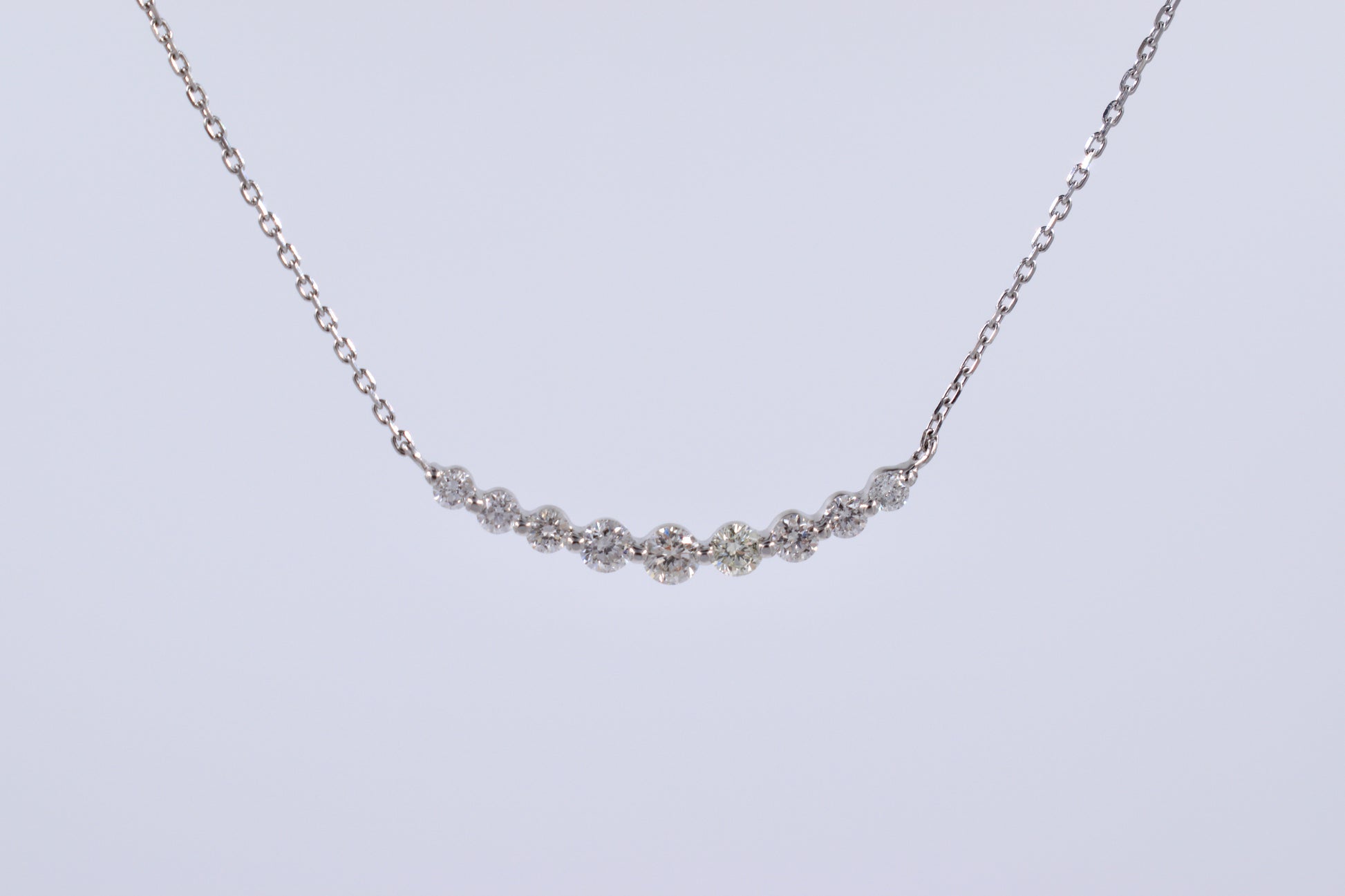 This necklace features a curved bar made of 18ct White Gold, with claw set graduating Diamonds. It is attached to an oval link chain and has a bolt ring clasp.