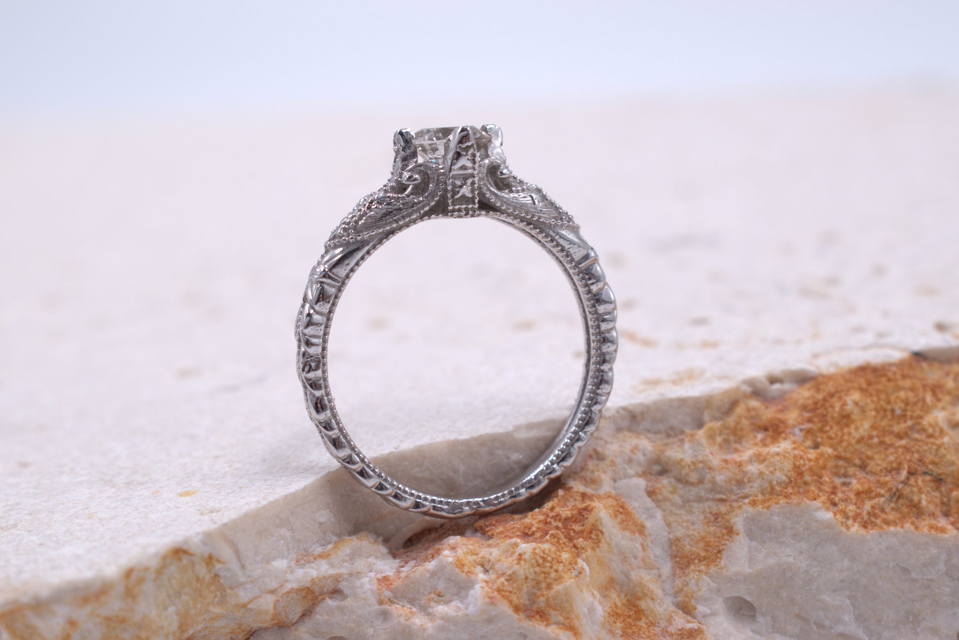 This beautiful 18ct white gold ring features a diamond set in a classic four claw setting. The band showcases a vintage pattern and delicate milgrain detailing along the shank.