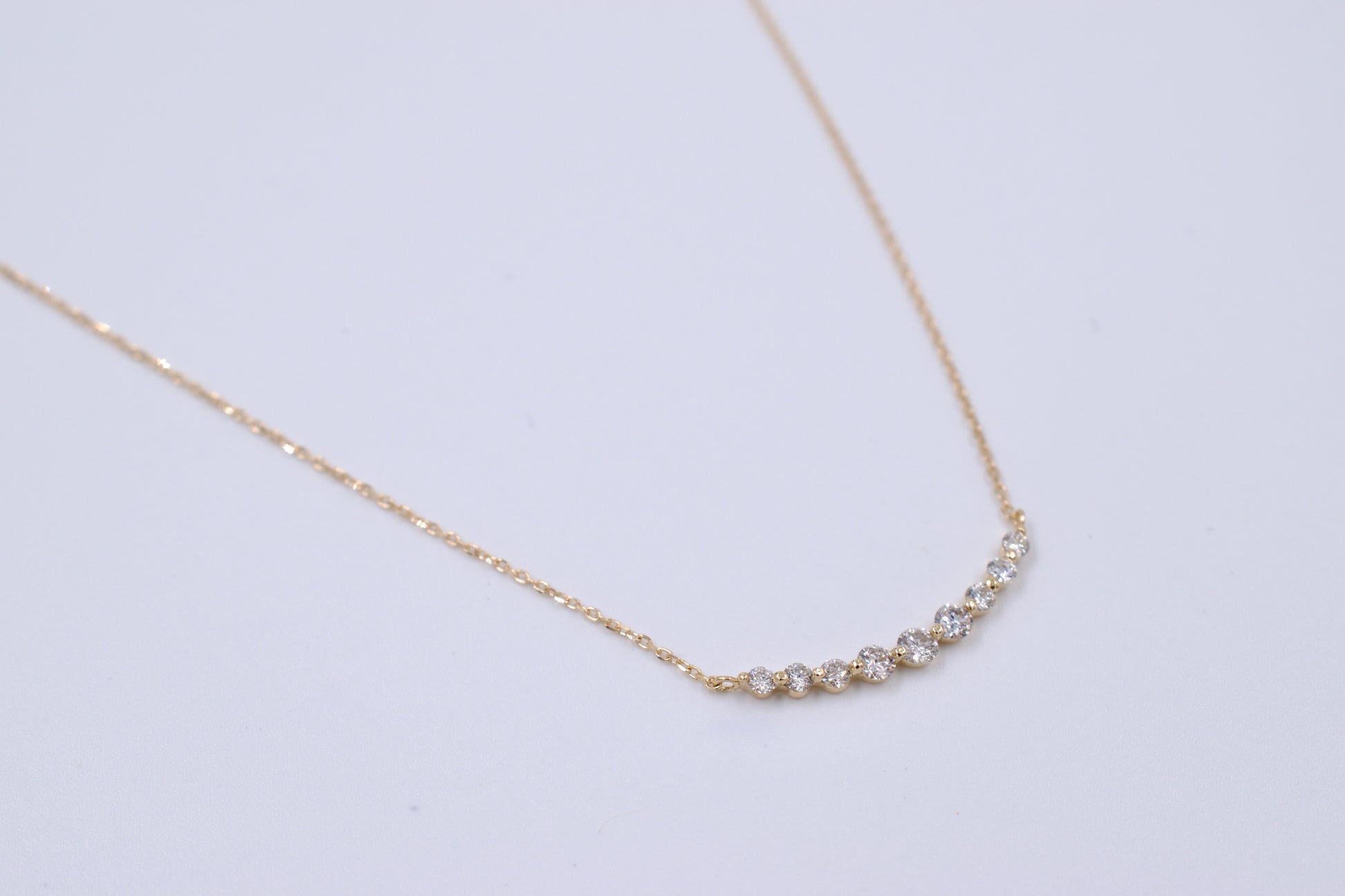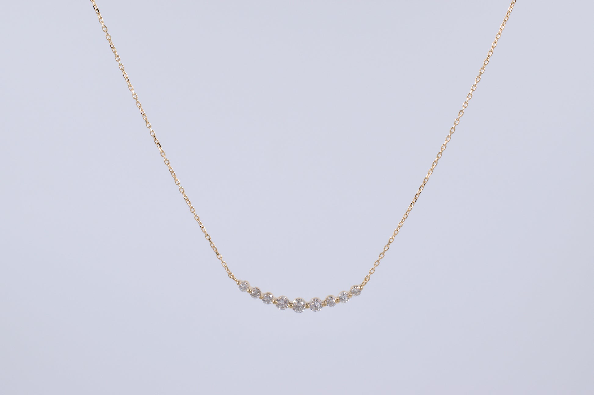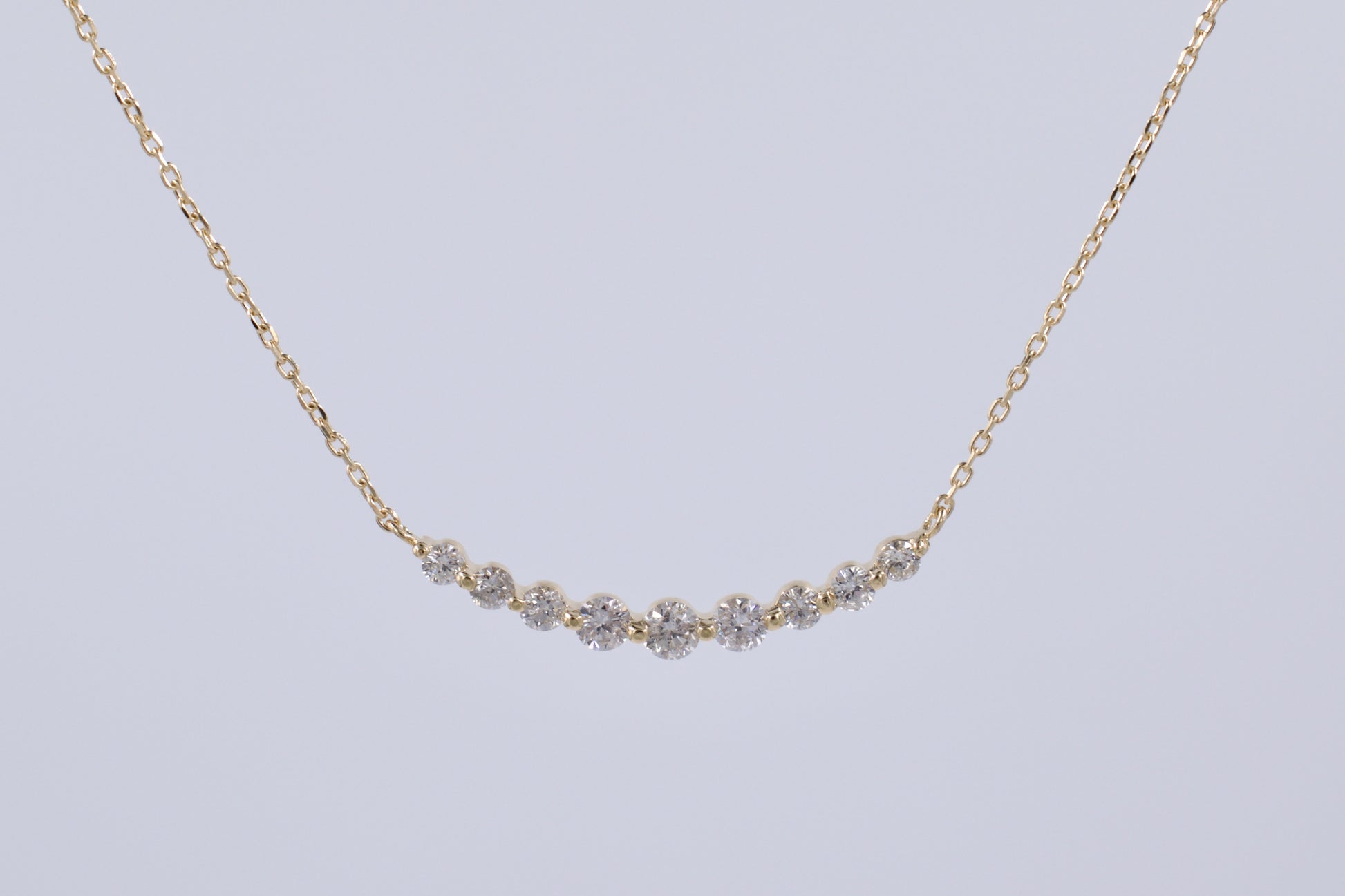 This 18ct Yellow Gold necklace features a curved bar with claw set graduating Diamonds, attached to an oval link chain with a bolt ring clasp.