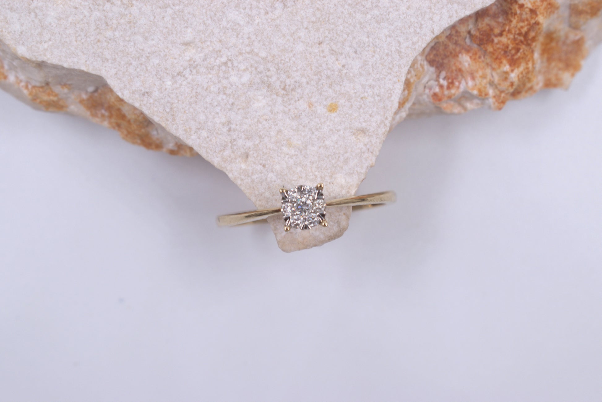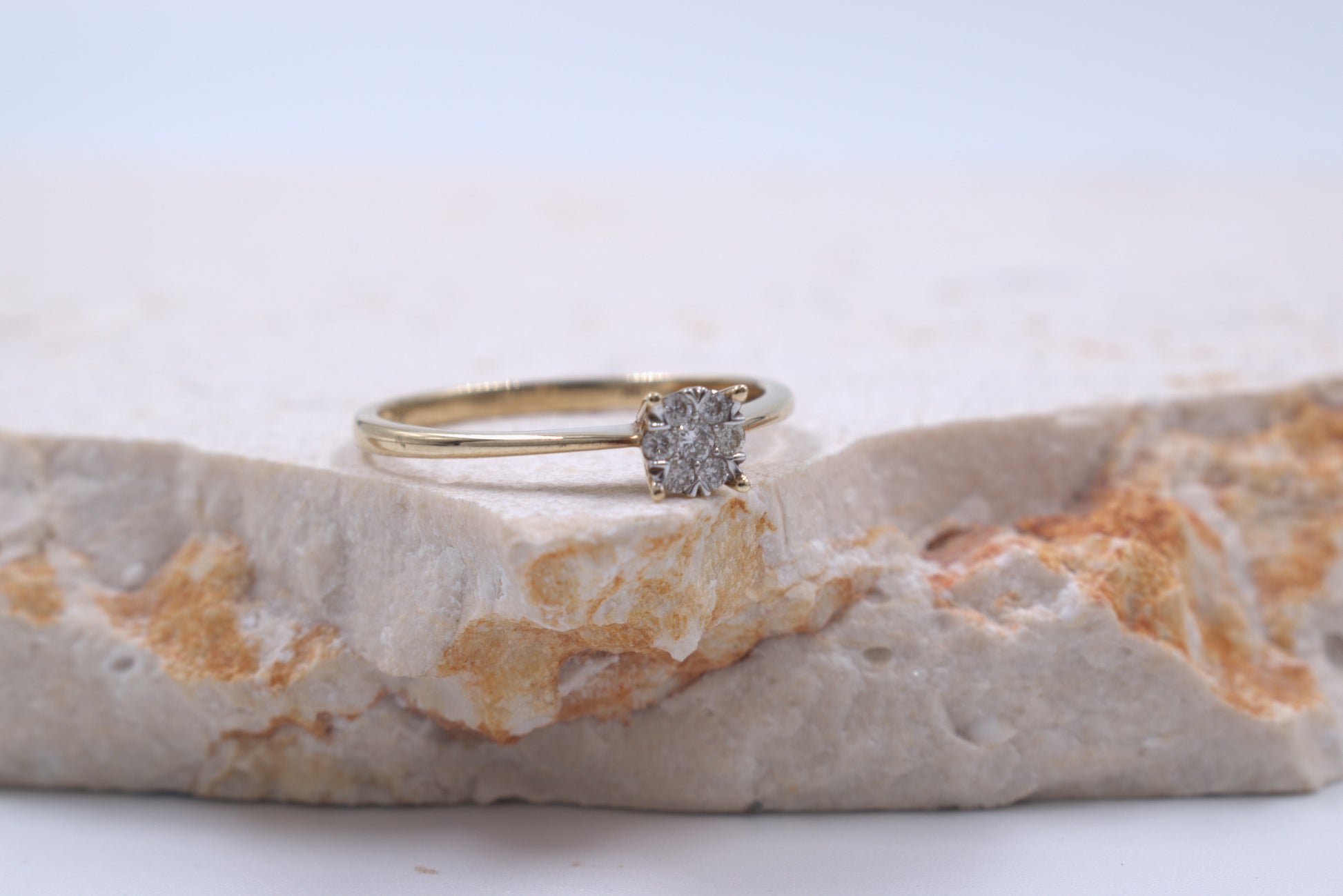 This beautiful 9ct yellow gold ring features a dainty band and a stunning illusion style setting adorned with diamonds.