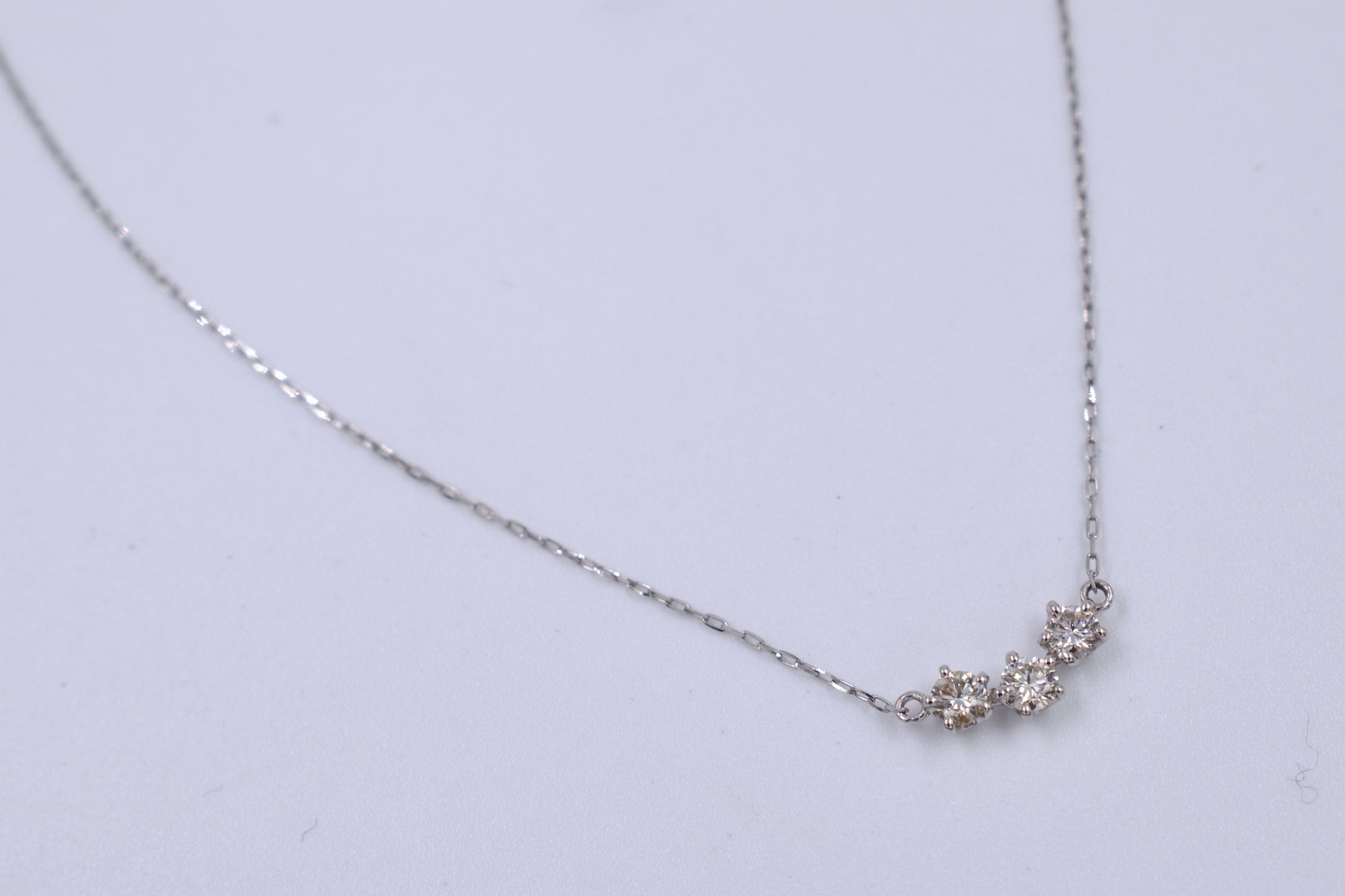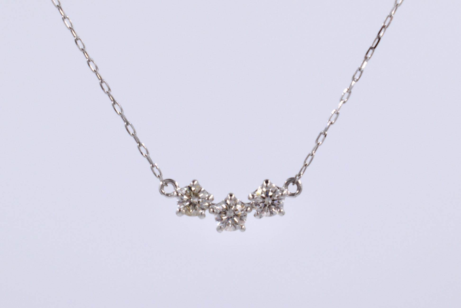 This platinum necklace features a claw setting set with three dazzling diamonds and an oval open link chain with a bolt ring clasp. Perfect for any occasion, this necklace will add a touch of elegance and sparkle to your outfit.