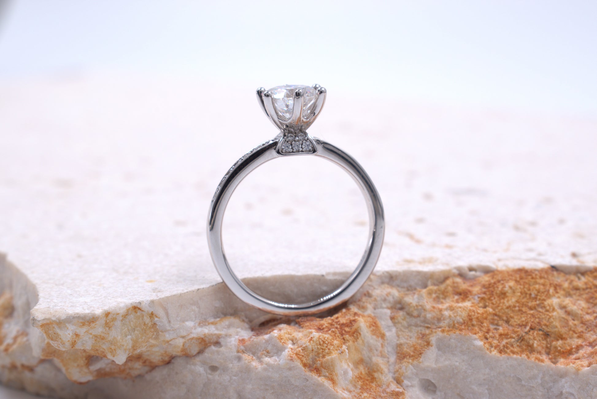 This stunning Sterling Silver rhodium plated, Moissanite Ring features a 6-claw setting with a beautiful Moissanite stone. The band is adorned with cubic zirconias, adding a touch of elegance. The raised setting on the side profile also showcases additional cubic zirconias for added sparkle.