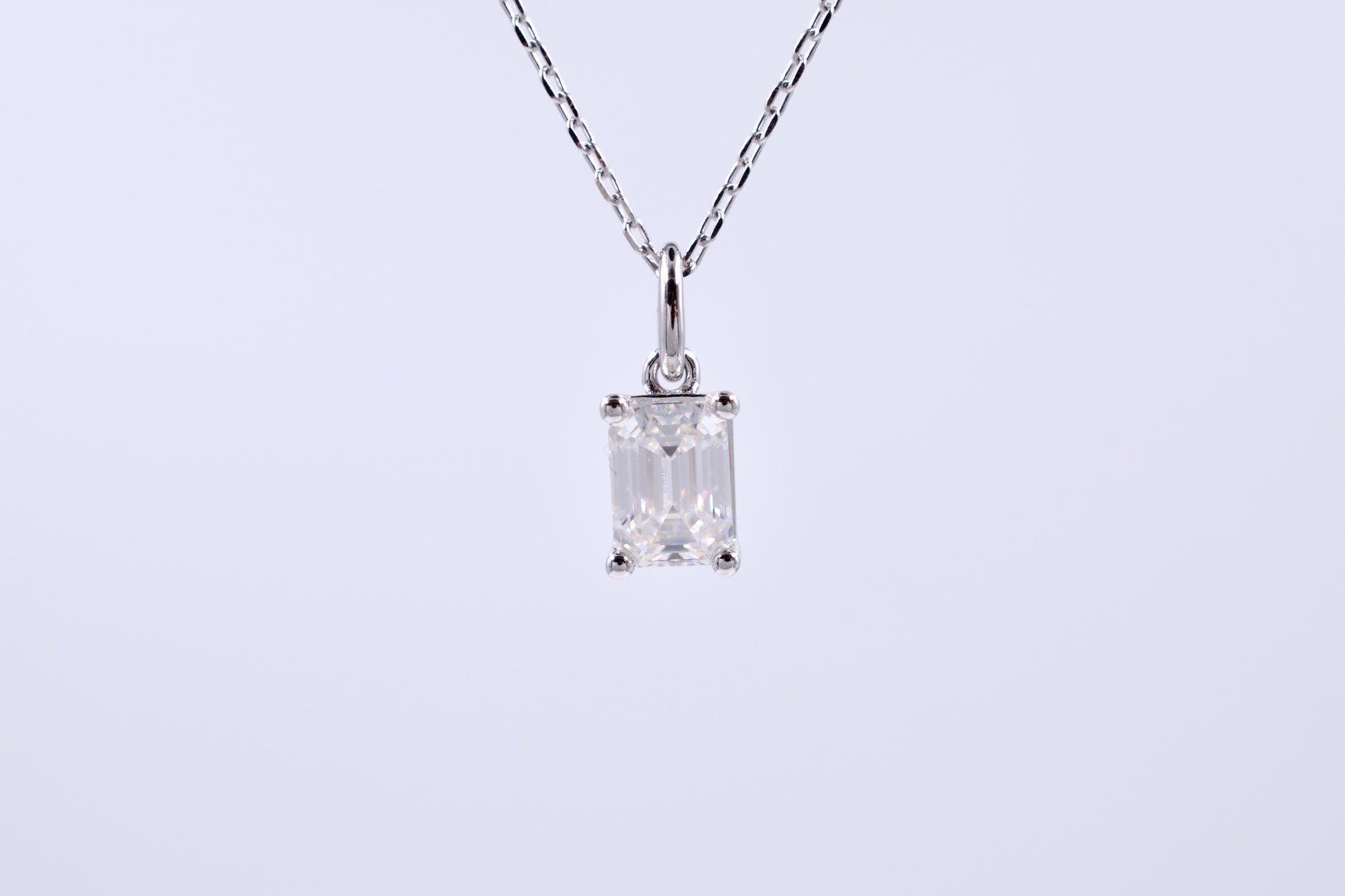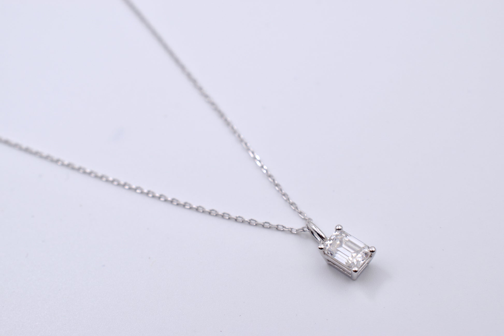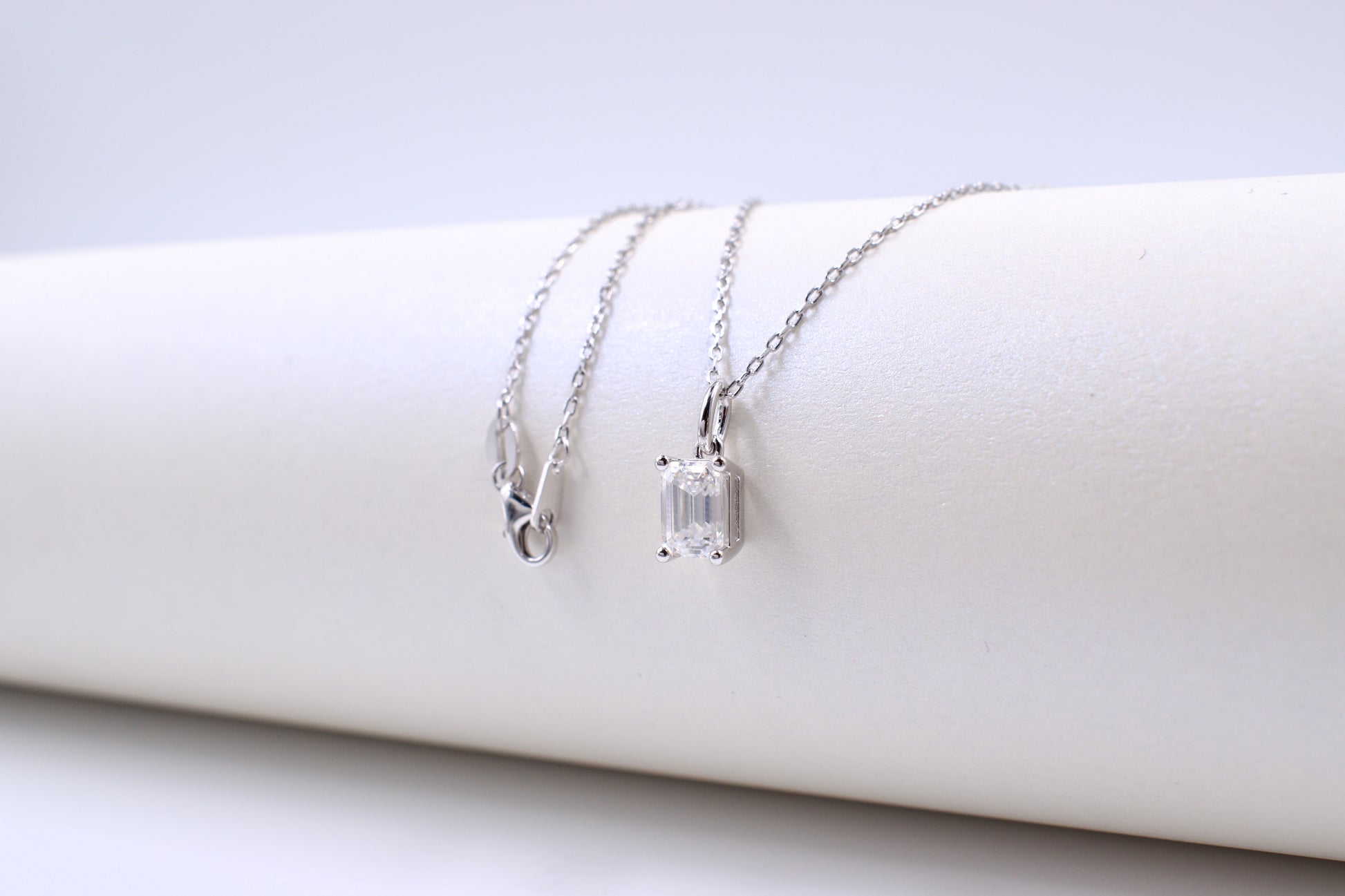 This necklace features a beautiful emerald cut Moissanite set in a four claw setting on a sterling silver chain with 18ct rhodium plating. The chain is an oval open link and is secured with a lobster clasp.