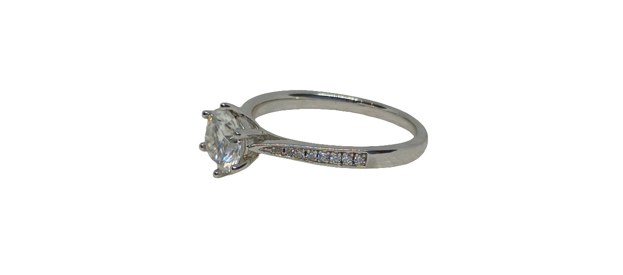 Sterling silver 18ct rhodium plated moissanite with cubic zirconia channel set shank ring