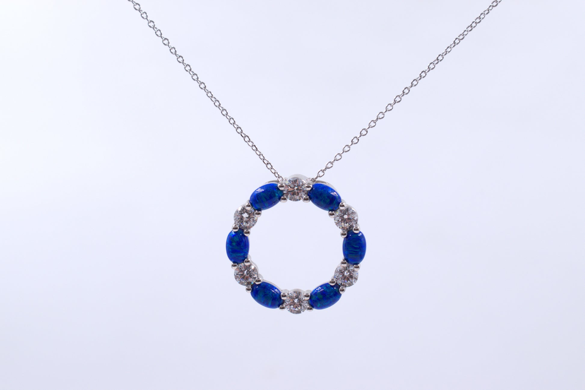This necklace features a circle of life pendant/slider made of sterling silver. The pendant is adorned with oval-shaped lab grown blue opals and a round cubic zirconia next to each opal. The chain is an adjustable 45cm open link with an Italian clasp.
