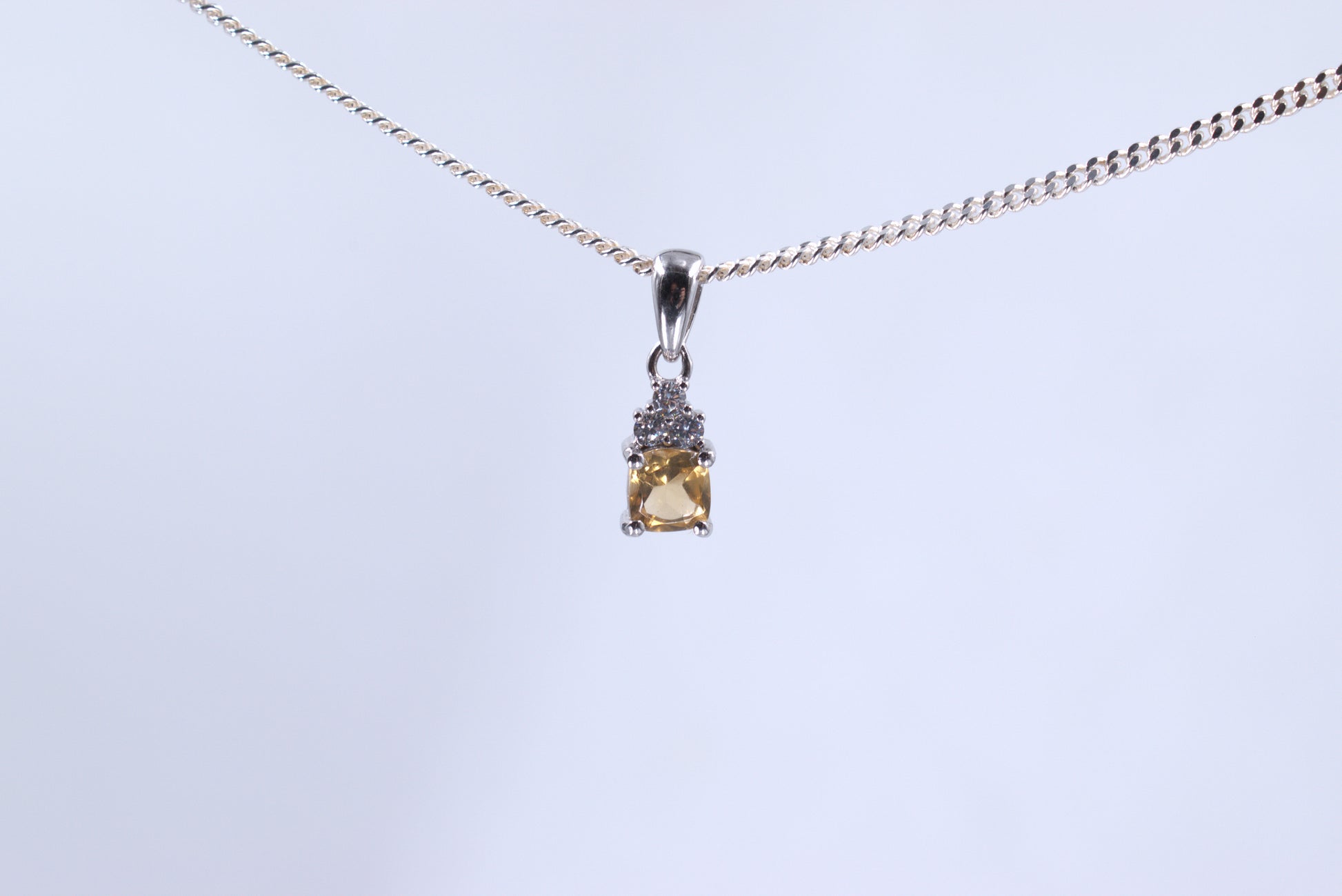 This Sterling silver pendant features a lovely cushion cut Citrine, securely held in place by four claws. Three round white Topaz stones sit atop the Citrine, adding a touch of sparkle to the design.