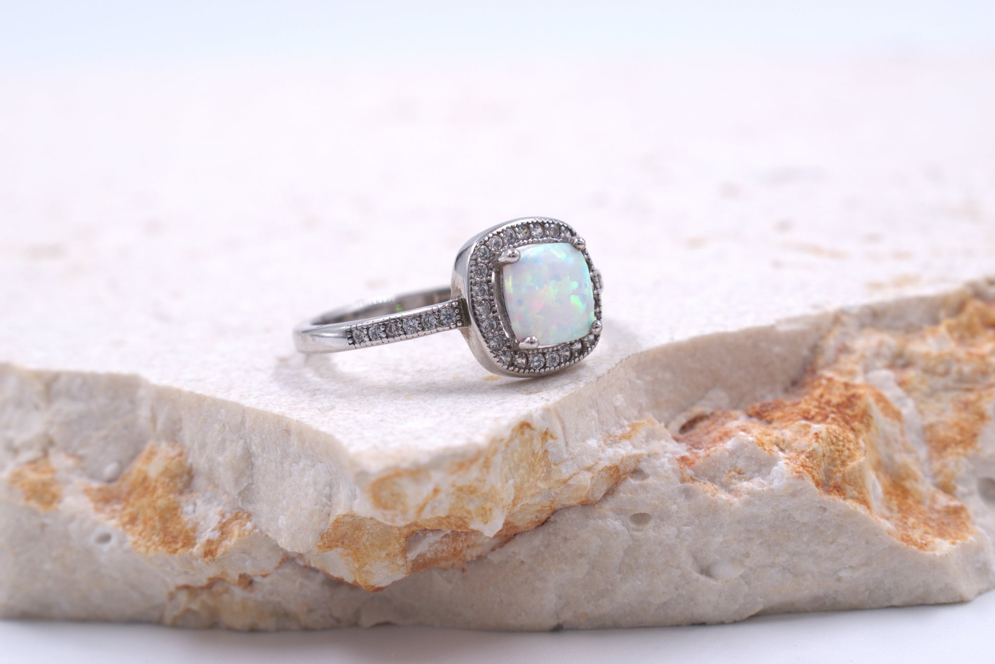Sterling Silver Cushion Cut Crushed White Opal Ring (October Birthstone)