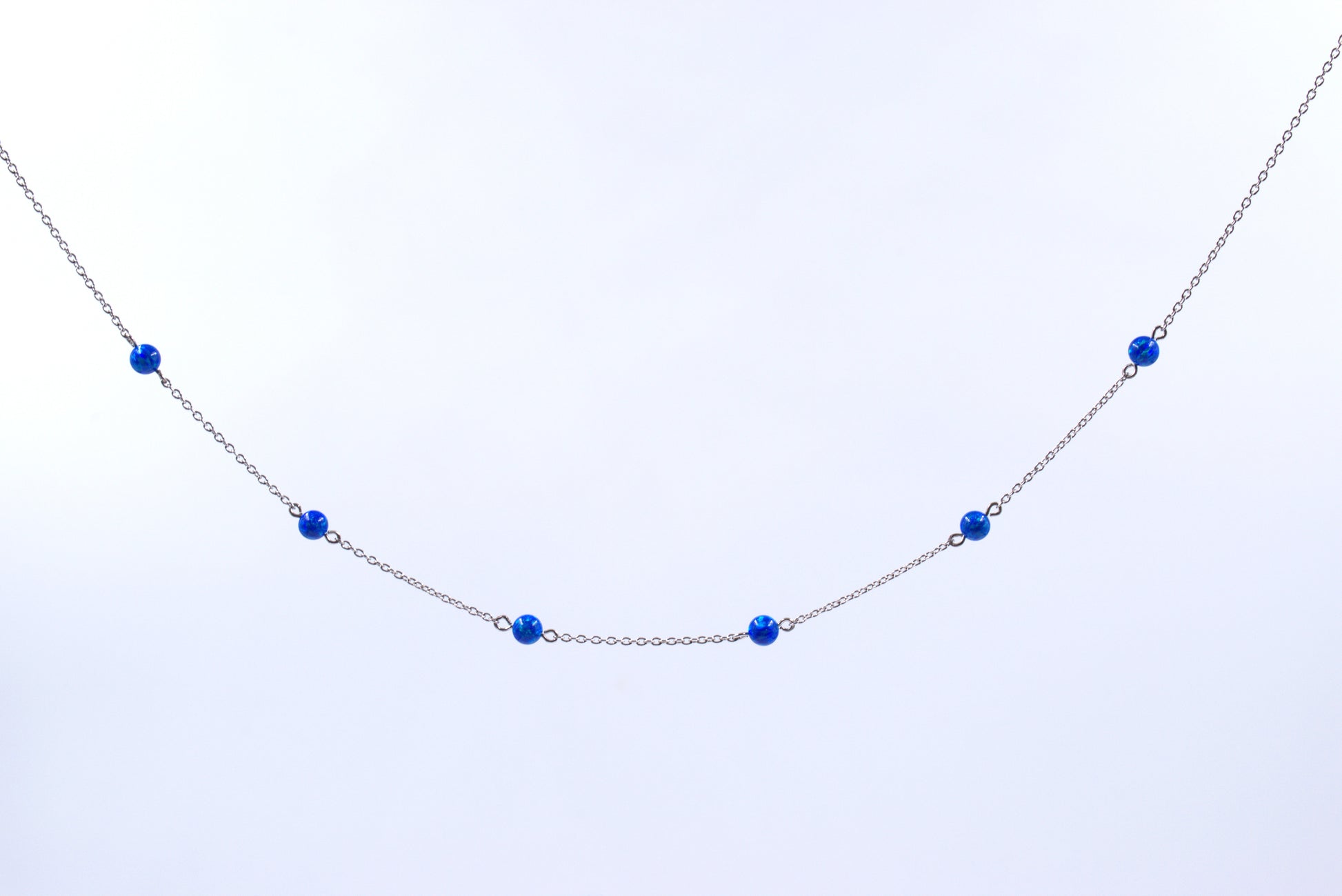 This Sterling Silver necklace open link chain features lab grown blue opals in a floater style, with a lobster clasp for easy wearing. It has a adjustable 45cm chain.
