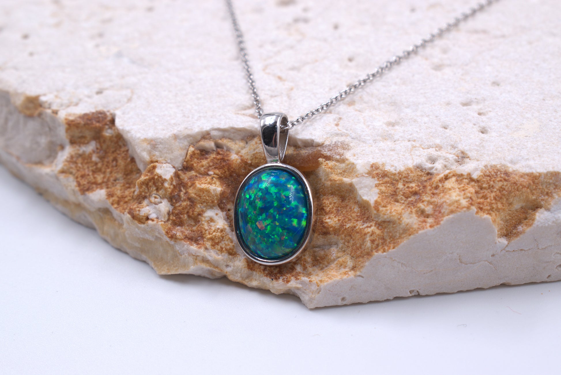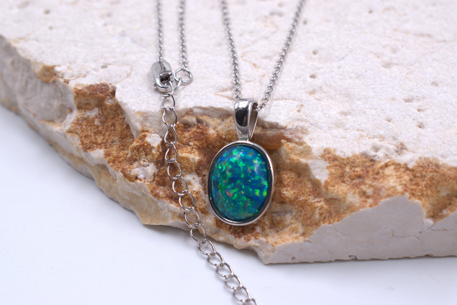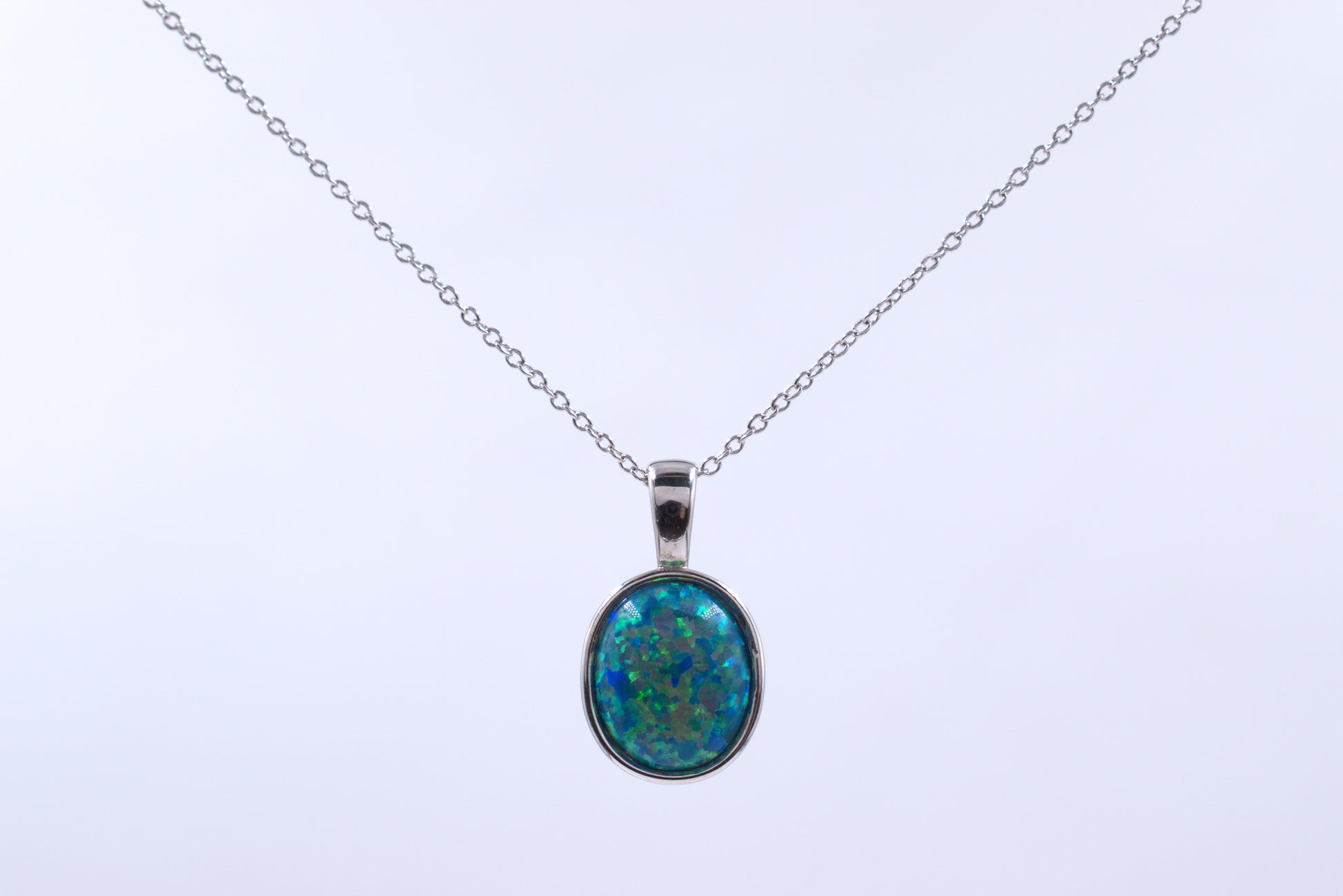 This sterling silver necklace features a lab grown oval green opal tubeset pendant. The chain is a 45cm adjustable open link chain with an Italian clasp.