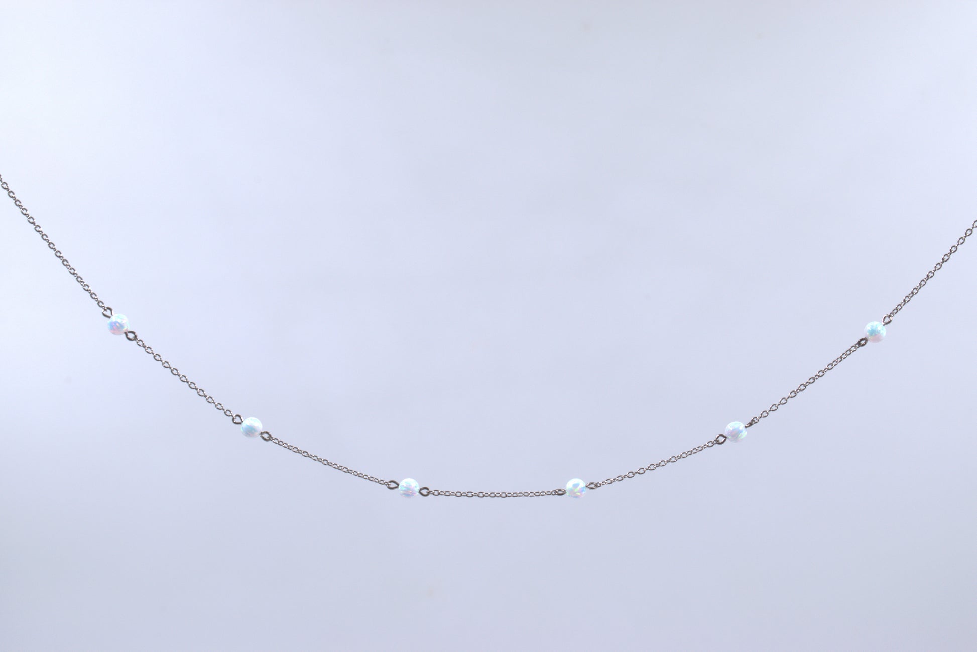 This Sterling Silver necklace open link chain features lab grown white opals in a floater style, with a lobster clasp for easy wearing. It has a adjustable 45cm chain.
