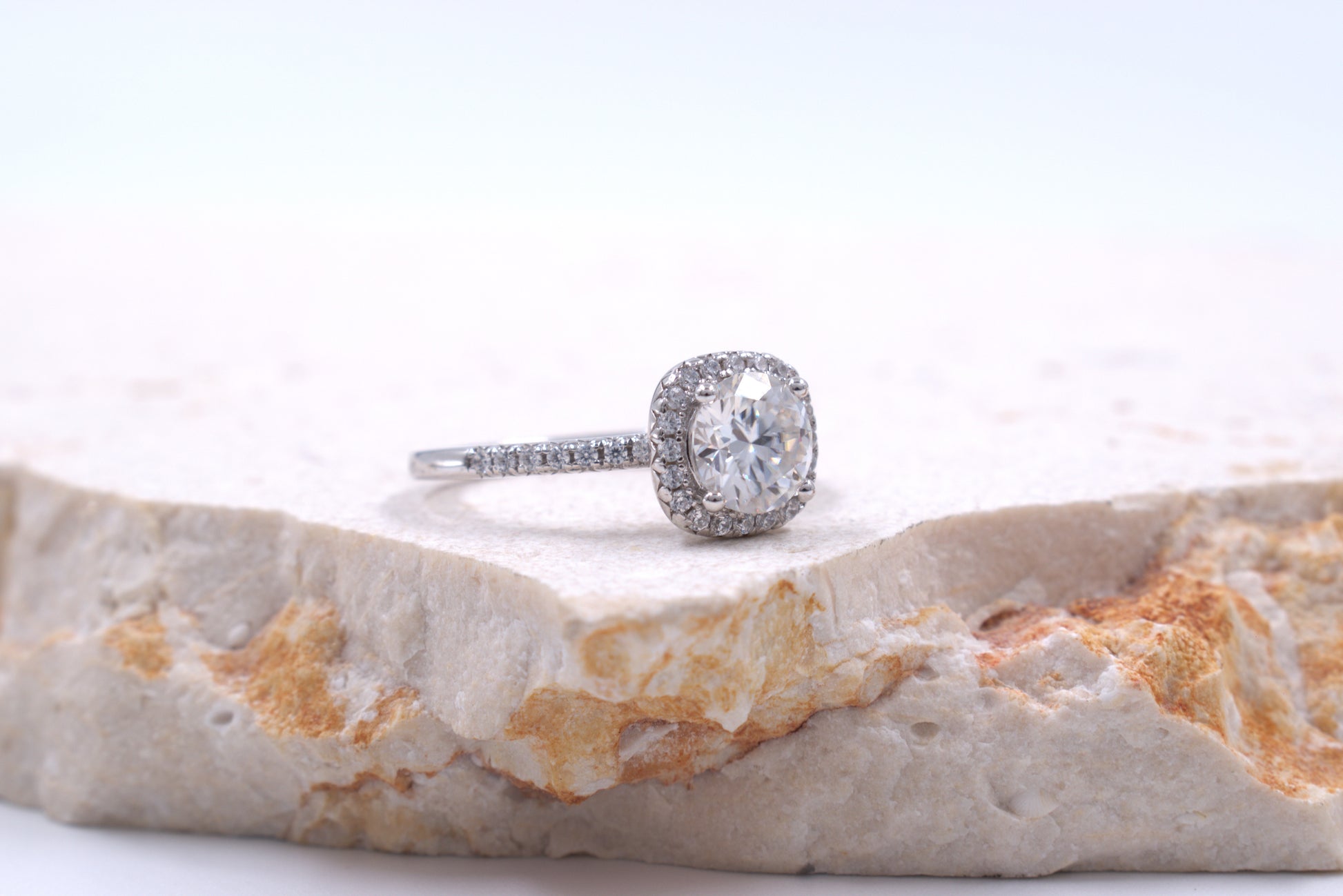 This beautiful sterling silver ring is rhodium plated and features a gorgeous round Moissanite stone at its center. A dazzling halo of cubic zirconia and additional cubic accents along the band create a truly breathtaking design.