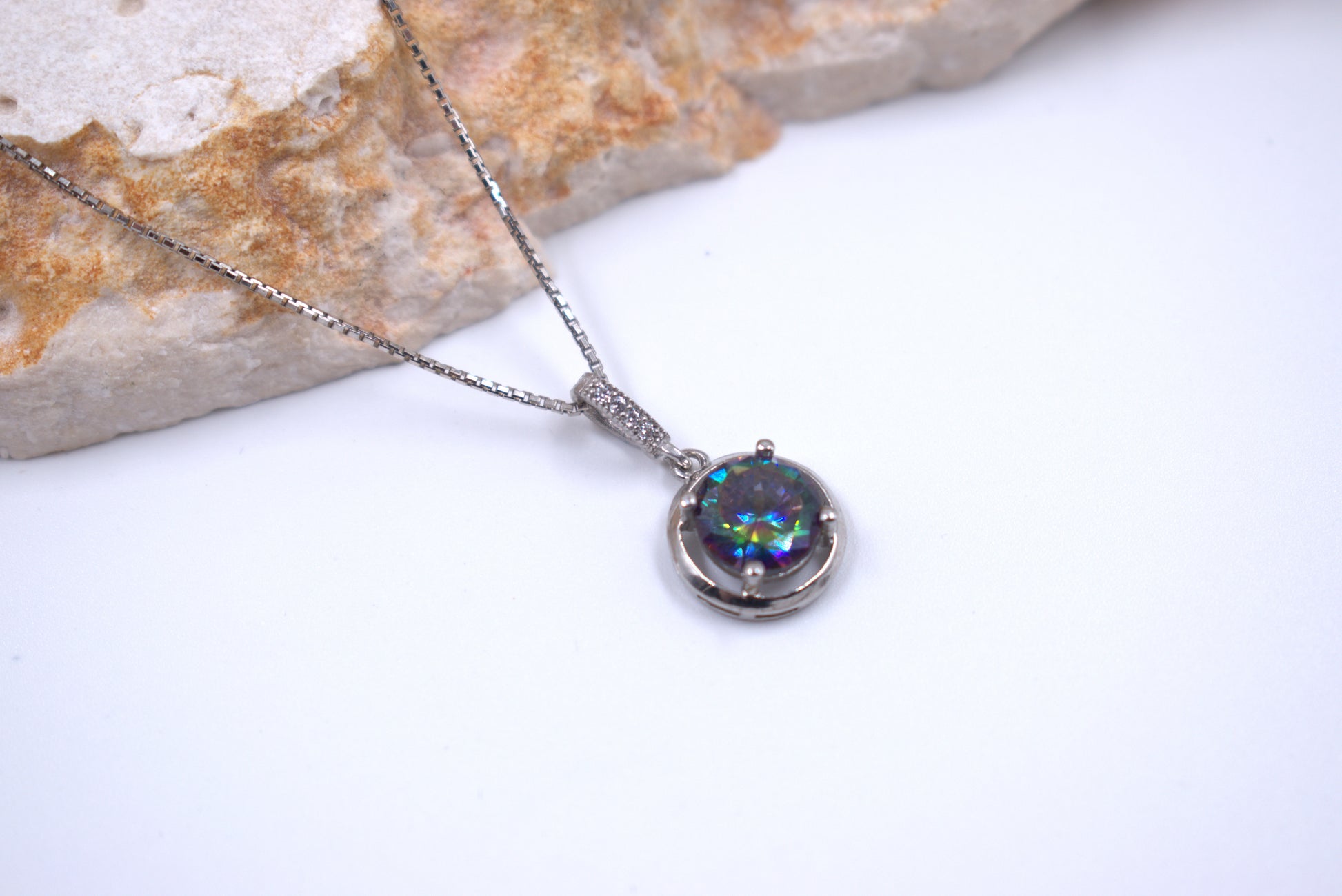 Enhance your jewelry collection with this stunning Sterling Silver necklace that features a round Mystic Topaz in a four claw setting, beautifully accented by a simple silver halo.