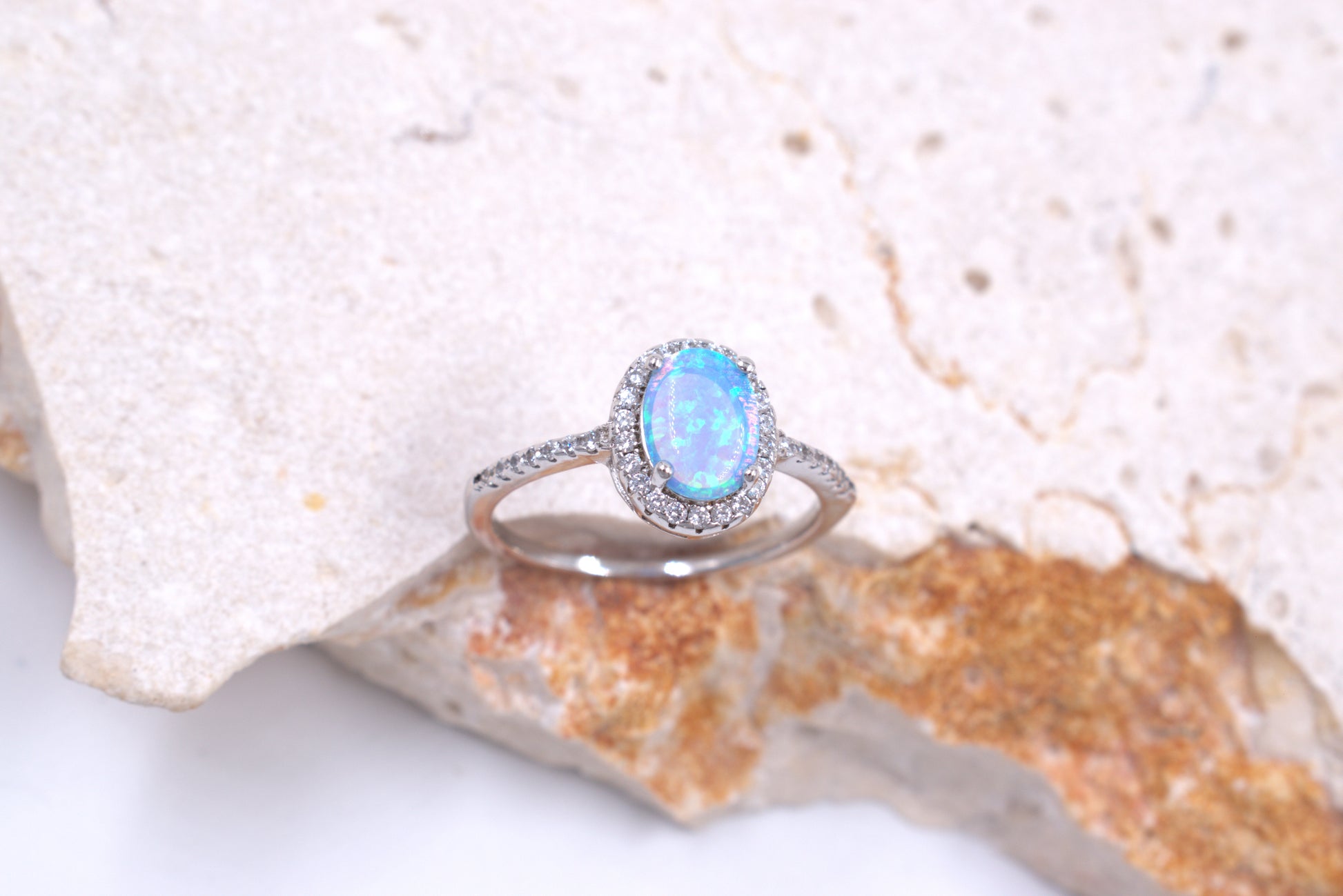 SThe sterling silver ring features an oval crushed blue opal set in a 4-claw setting. Surrounding the opal is a halo of cubic zirconias, with additional cubics leading down the sides of the band.