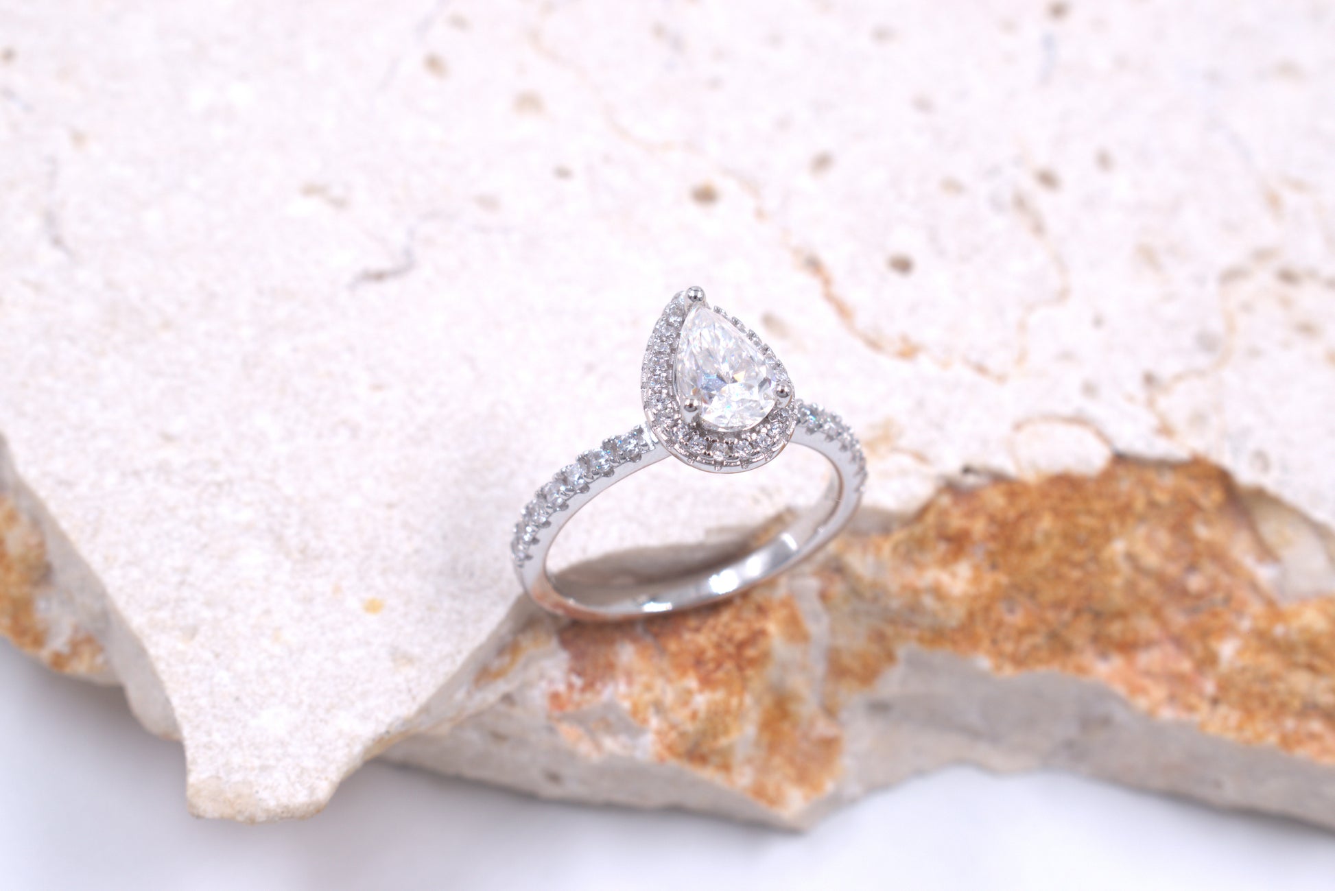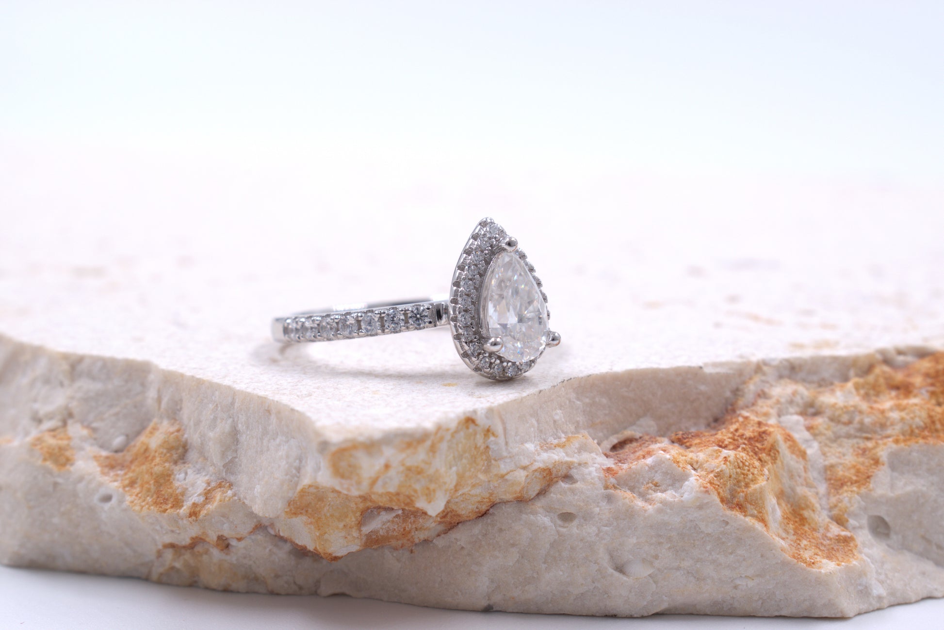 This sterling silver ring is rhodium plated and features a pear-shaped Moissanite stone set in a four claw setting. Surrounding the center stone is a halo of cubic zirconia and cubics lead down the sides of the ring.