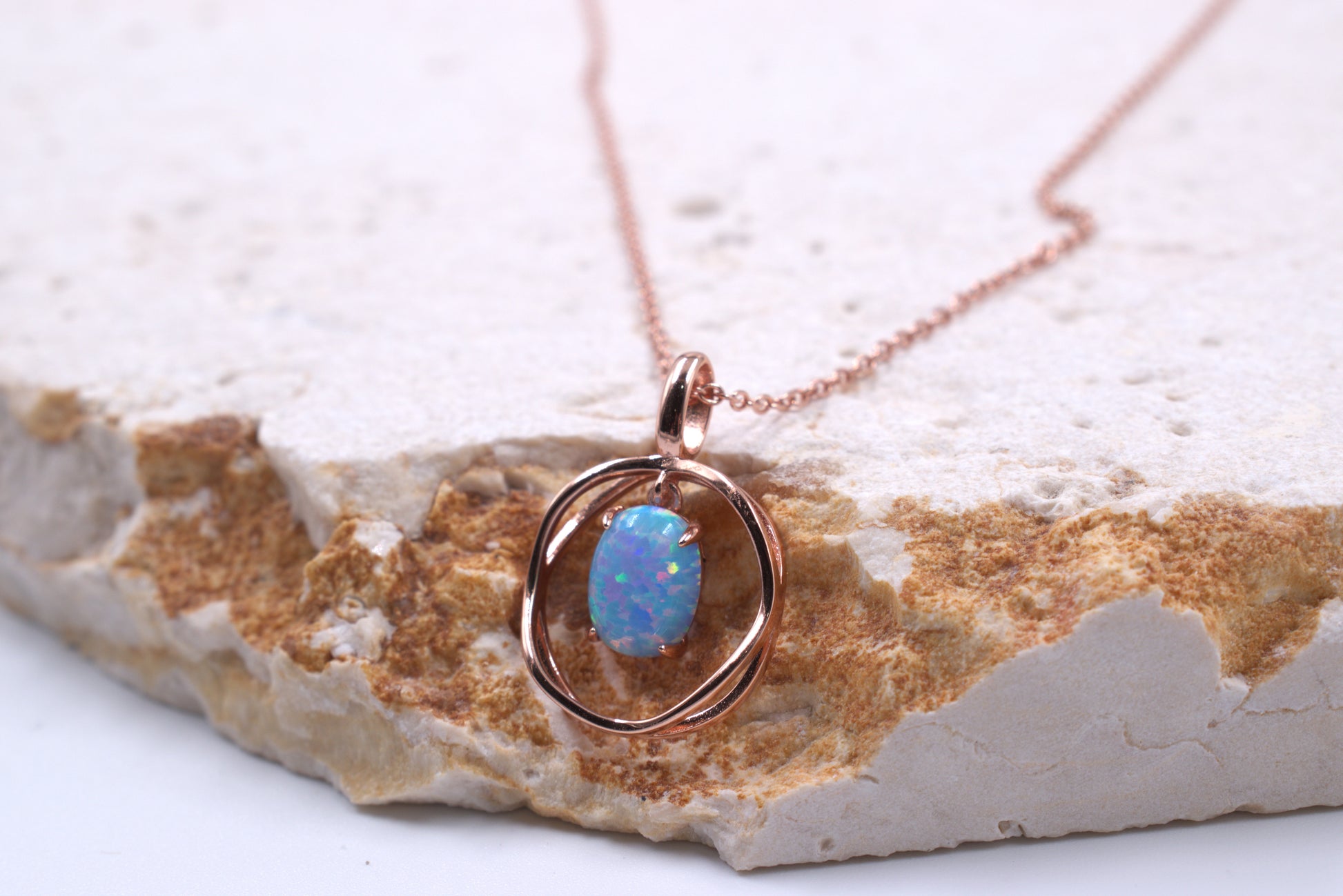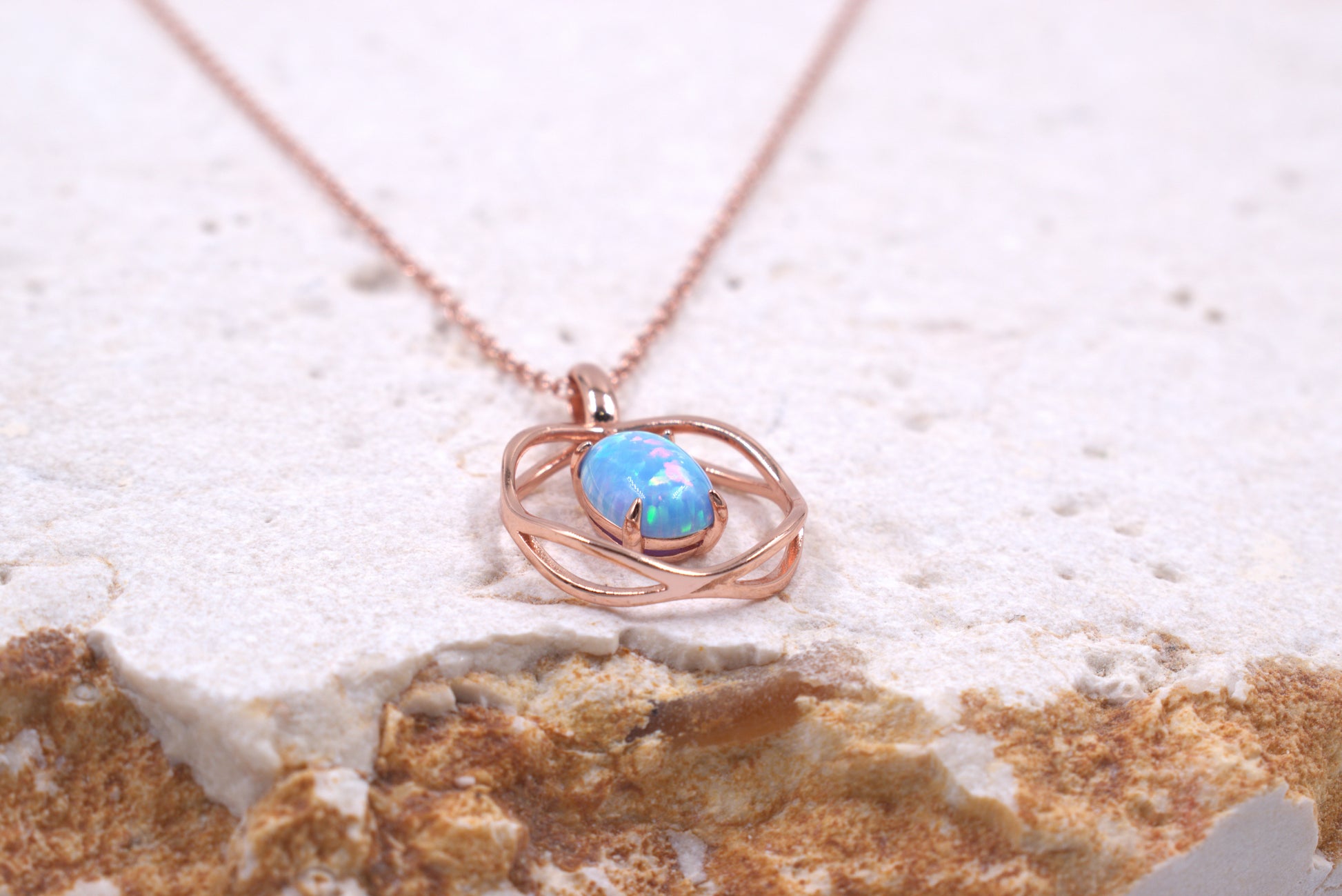 This stunning sterling silver rose gold plated necklace features a beautiful oval lab grown light blue opal held in place by a 4 claw setting. The opal is surrounded by a wavy design halo. The necklace is completed with a 45cm adjustable open link Rose gold plated chain fastened with a Italian clasp.