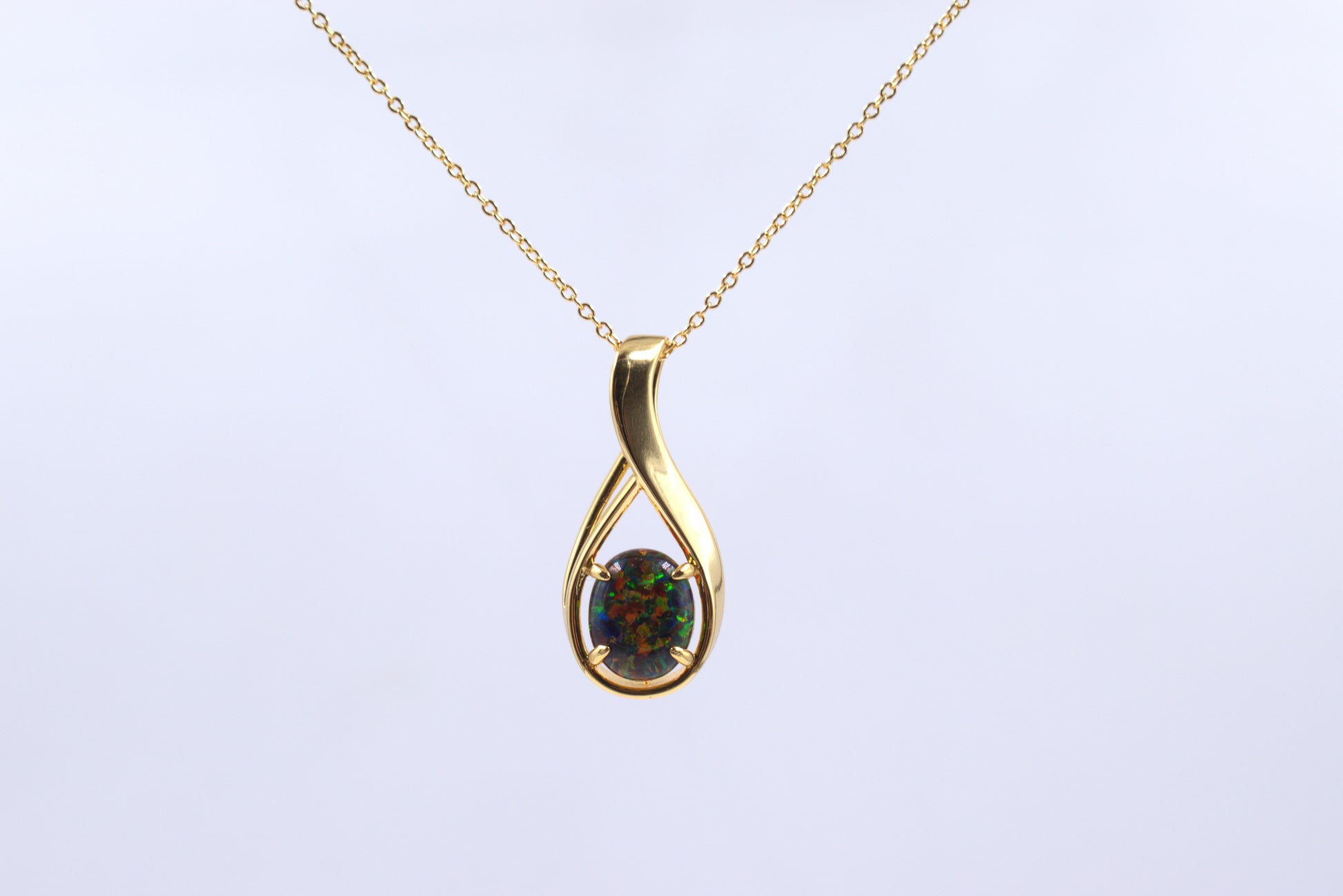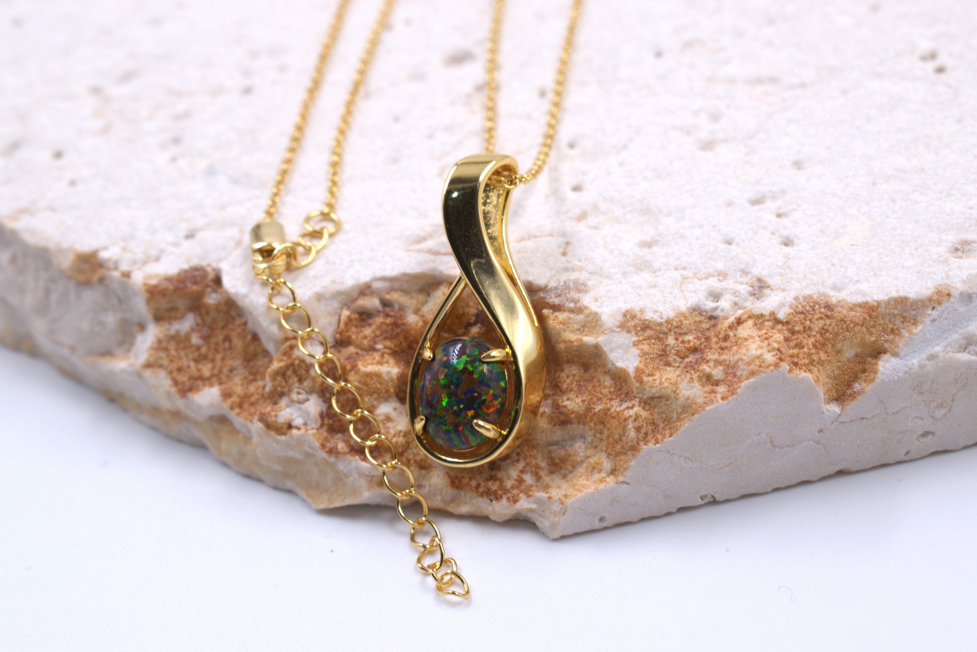 This stunning necklace features a twisted style pendant made of yellow gold plated sterling silver with a 4 claw setting, showcasing a beautiful oval lab grown dark green opal. The accompanying chain is a 45cm open link sterling silver and yellow gold plated chain fitted with an italian clasp.